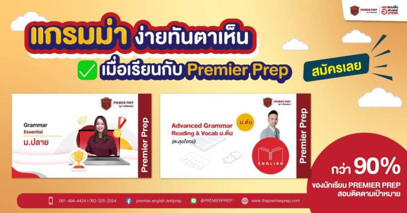 ถ้าน้องๆสนใจที่อยากจะเรียนแกรมม่าแบบเข้าใจง่าย เป็นระบบ นำไปใช้จริงล่ะก็ ที่ Premier Prep มีคอร์ส Advanced Grammar ของระดับชั้นมัธยมต้นและคอร์ส Grammar Essential สำหรับระดับชั้นมัธยมปลาย ที่รับรองว่า เรียนปุ๊บ เข้าใจปั๊บแน่นอน สามารถติดต่อสอบถามเพิ่มเติมได้ที่ LINE OA ของ Premier Prep ได้เลยครับ
